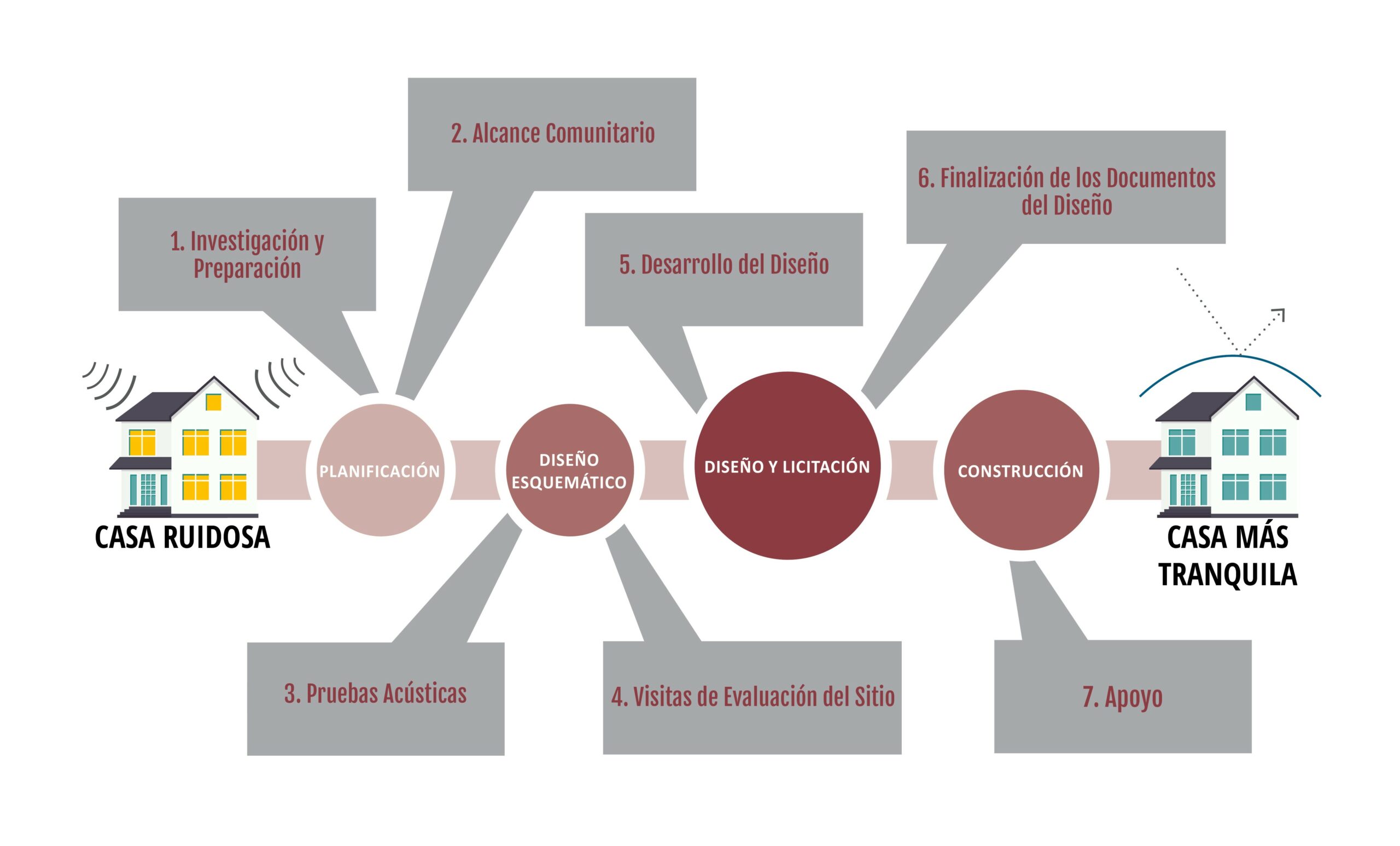 Utilizando una fuente de ruido artificial, se tomarán mediciones acústicas de los niveles de ruido exterior e interior de casas seleccionadas. Esto determinará la capacidad de reducir el ruido en paredes, techos, ventanas y ensamblajes de puertas existentes. Estas pruebas duran aproximadamente dos horas. Esta información será utilizada por el equipo del RSIP para tomar decisiones de los tratamientos acústicos.